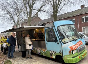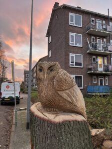 Boswachter en boomkunstenaar Rick maakte van de stam van een afgekapte boom voor nummer 156 een heel mooie kunstige uil! Loop eens door de straat en bewonder de uil gerust van dichtbij. Naast hem stond de gezellige kraam waar poffertjes en warme chocomelk werd uitgedeeld.