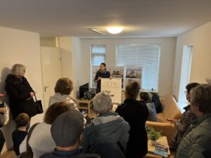 Al gauw had Anne Marie van Mecanoo een woonkamer vol mensen die graag meer hoorden over de kap van de bomen en vooral ook over het nieuwe groen dat terug gaat komen in de wijk. Ook over de planning van de bouw van de wijk werd uitgebreid gepraat.
