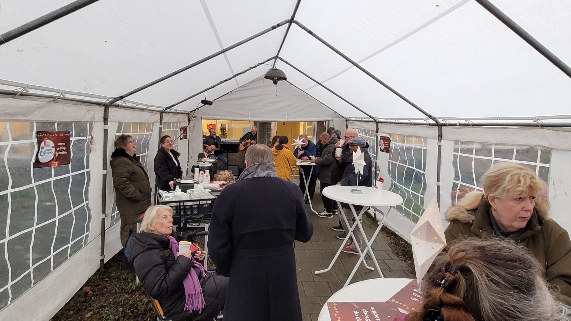 Onder de prachtige tent met heater kwamen ongeveer 60 bewoners samen die elkaar soms voor het eerst zagen en zo met elkaar kennis hebben gemaakt. Deze bewoners hebben ook weer kennisgemaakt met de al actieve bewoners in het Wijkcentrum en met Errol Zeefuik en Karin van Frankenhuyzen van Welzijn Rijswijk. Alles was door bewoners mooi aangekleed met statafels, placemats en mooie ‘soep op de stoep’ bekers. Warme chocomelk was ook beschikbaar.